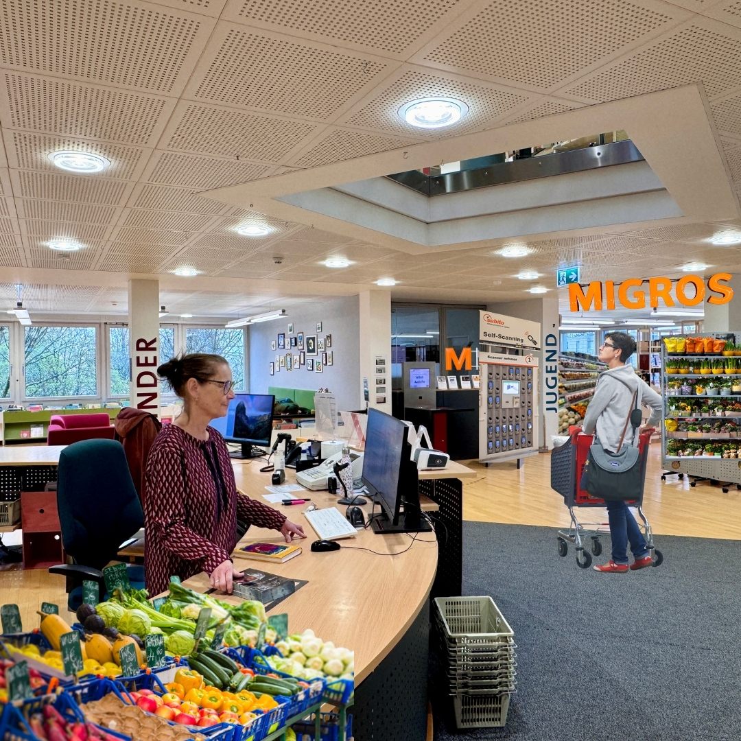 Wenn die Geschäftsbeziehungen des Schaaner «Lädeli»-Pioniers Stefan Ospelt zur Migros im September 2026 enden, wird es nur noch zwei Migros-Filialen in Liechtenstein geben. In Absprache mit dem Wirtschaftsministerium reagiert die Liechtensteinische Landesbibliothek auf den akuten Migros-Mangel und geht eine Kooperation ein: Zwi-schen Romanen, Lexika und Reiseführern finden sich nun auch Rüebli, Schokolade und Kaffee. Bücher und Einkaufen verschmelzen so zur ultimativen Bildungsreise. Wer ein Buch ausleiht, entdeckt vielleicht gleich daneben ein Sonderangebot im Regal, so wird Lesen plötzlich noch lohnender.